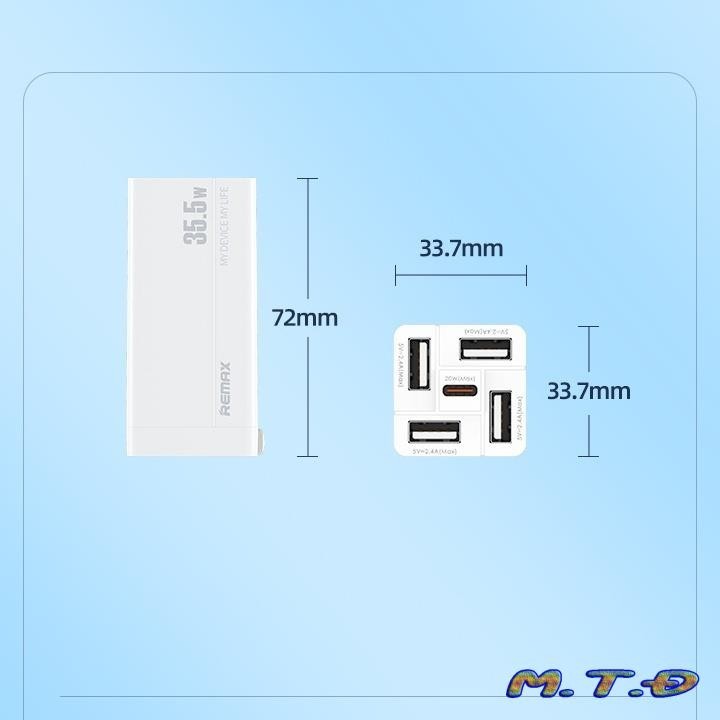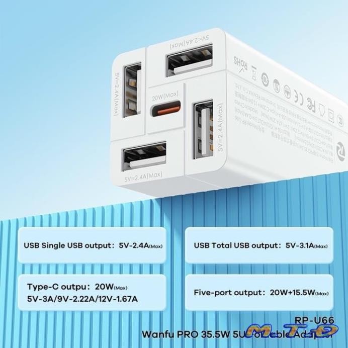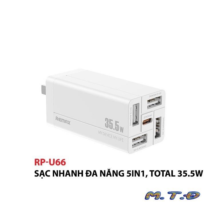 – Tên sản phẩm: Cóc sạc nhanh đa năng 5 in 1 Remax RP-U66 4 Cổng USB 1 Cổng Type C 20W (Max) – Total 35.5W (Max)