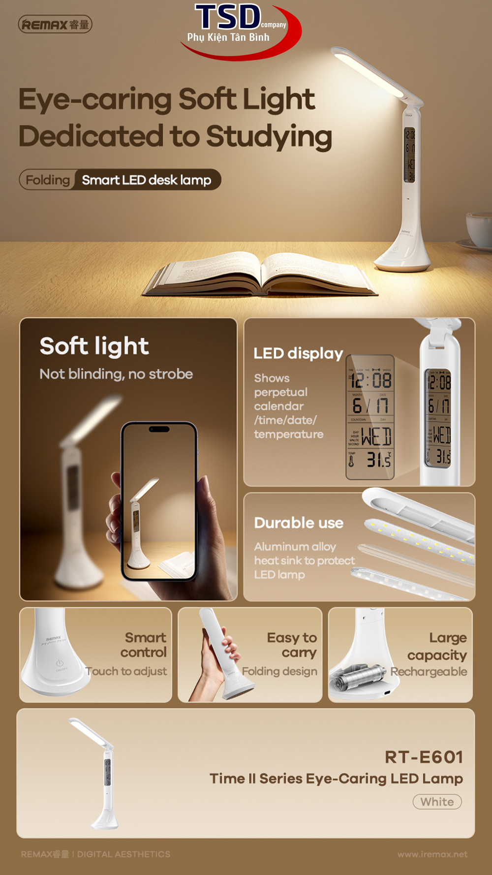 – Không chỉ là chiếc đèn led đơn giản, Remax RT-E601 còn là chiếc đồng hồ báo thức thông minh. Thân đèn hiển thị đồng hồ xem giờ, ngày, tháng và nhiệt độ và có thêm chế độ báo thức. Bạn có thể dễ dàng cài đặt theo hướng dẫn và sử dụng vô cùng tiện lợi.