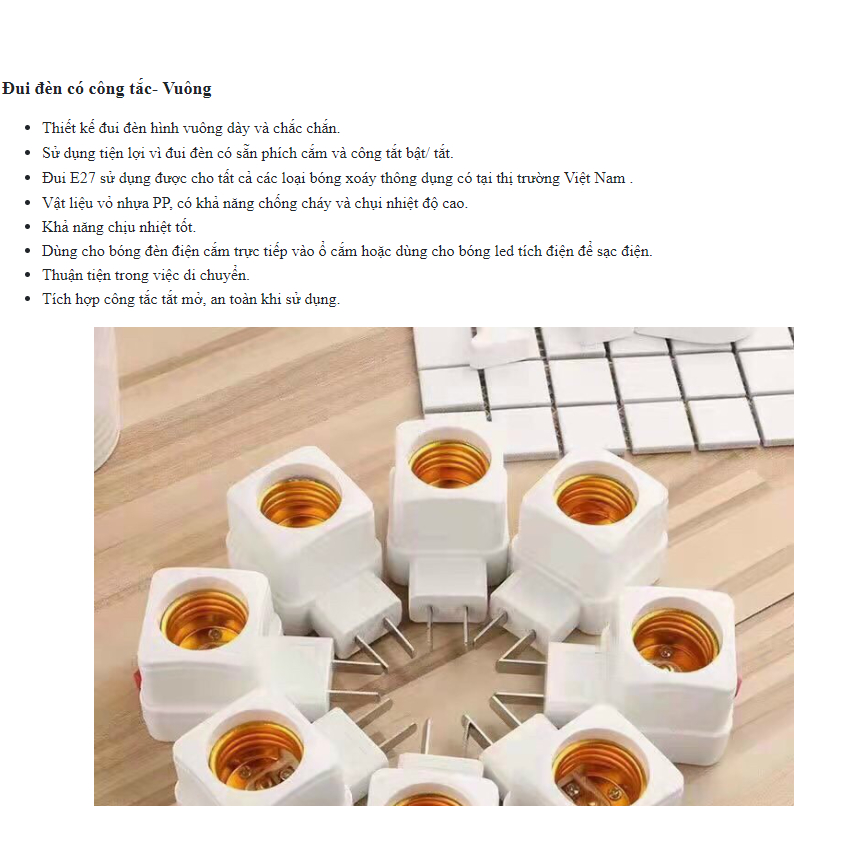 – Đui đèn có công tắc thiết kế dây dẫn bằng đồng, có 2 lớp cách điện, chống bị trầy lớp nhựa cách điện, chịu tải, chịu lực tốt.