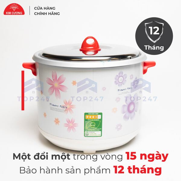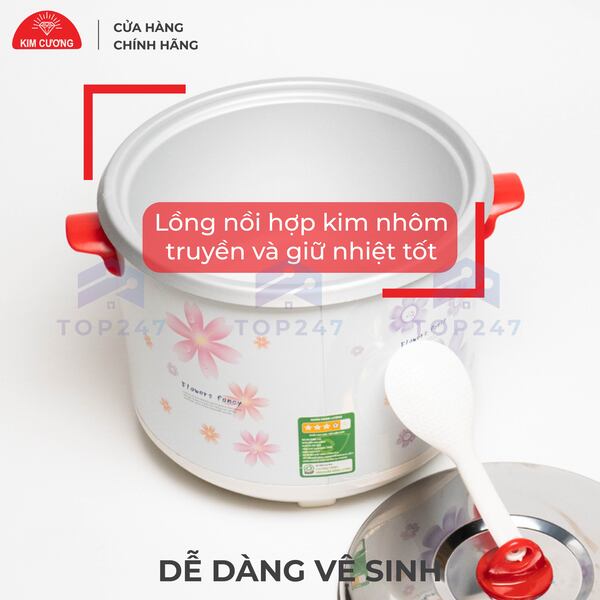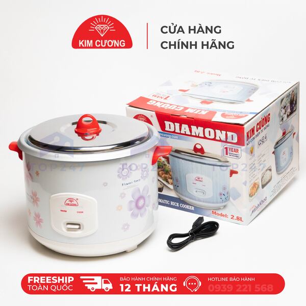 - Nồi cơm điện 2.8 lít Kim Cương có kiểu dáng tao nhã kèm hoa văn với màu sắc hài hoà rất có thẩm mỹ. Vỏ nồi là nhôm chống gỉ và phần nắp là inox cao cấp, giúp dễ lau chùi và tăng tuổi thọ cho nồi.